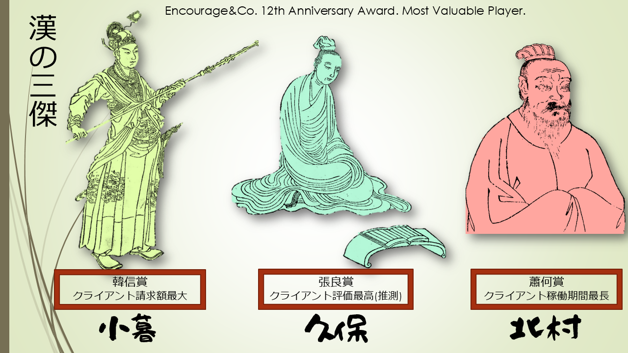 おかげさまで当社は12月18日で12周年を迎え、13年目がスタートします。 古代中国の皇帝は、臣下を過去の英雄に喩え功績をたたえました。 当社もそれにならい創立記念日にその年のMVPを3つの観点から表彰し、観点に相応しい英雄の名をつけた賞を贈ることにしました。 それぞれの英雄は下記のとおりWikiにリンクさせましたので、ご興味がある方はご覧ください。